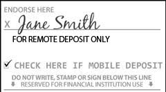 To endorse check accurately, please sign your name as the payee and include the words "For Remote Deposit Only" and check the box that says "CHECK HERE FOR REMOTE DEPOSIT".